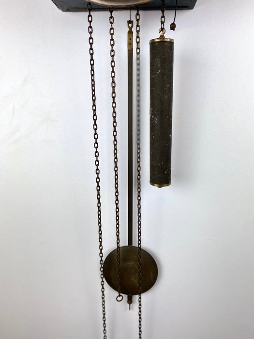 De klok bezit 2 gewichten, maar één van de kettingen is los waardoor het tweede gewicht niet gehangen kan worden.
