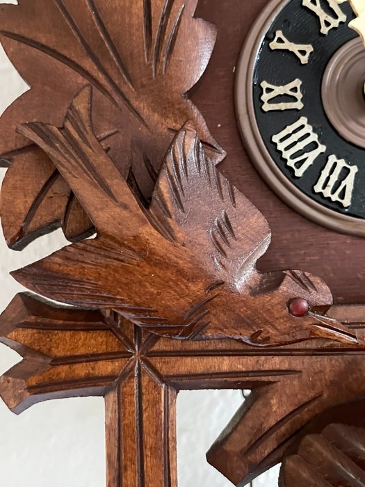 Een mooie koekoeksklok welk om het uur een gongslag geeft en de 2 voedende vogels aan de zijkant bewegen , met koekoeksroep ,en het vogeltje welk uit het deurtje komt.