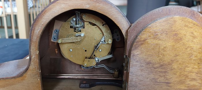 1. Deze FHS, Duitsland pendule is in een vintage staat. Hout vertonen gebruikssporen.Het binnenwerk is gemaakt door de beroemde Duitse klokkenmaker Franz Hermle & Sons. Het interne mechanisme is gestempeld FHS, Duitsland, 130-020.