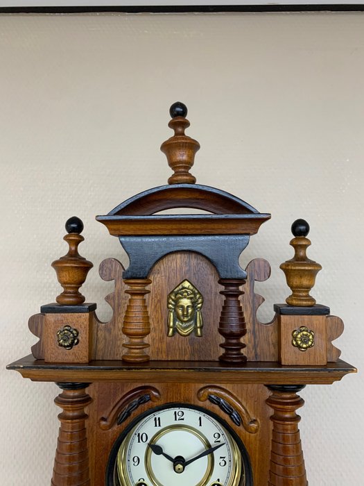 Het uurwerk is in een goed functionerende staat en word geleverd met zijn originele opwindsleutel en slinger.