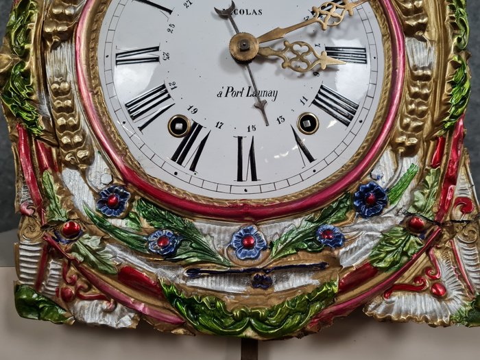 Mechaniek met 3 wijzers en een wijzerplaat met Romeinse cijfers en cijfers van Nicolas in Port Launay (Finistère).