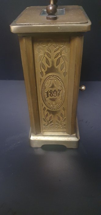 Klein handzaam messing tafelklokje met muziekcilinder, met bovenste glazen inzet (zicht op het werk) en draagbeugel. De klok is gemaakt door Pfeilkreuz in 1897 (H17cm x B 8,5cm x D 5,5cm). De klok rond worden filigraanpatronen in reliëf aangebracht. Het heeft een geëmailleerde wijzerplaat met zwarte Romeinse cijfers, messing wijzers en een klein kleurrijk bloemmotief en meesterteken.