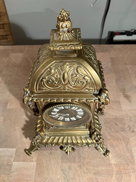 Mooie mechanische Franse genummerde bronzen klok. Versierd met diverse cartouches. Halve en hele slagen. Met originele slinger en sleutel. Geëmailleerde uren op de wijzerplaat in Romeinse cijfers.