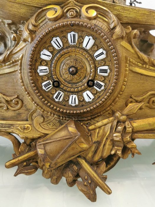 Het verguldsel is zeer fijn, wat lichte slijtage, wijzers en slinger ontbreken.
