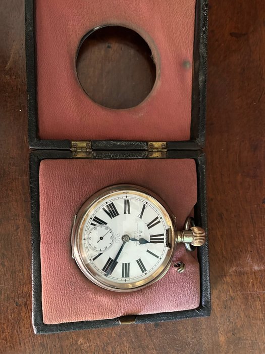 Prachtig zilveren montuur van 250 gram plus horloge van 284 voor een totaal gewicht van 534 gram. Het montuur meet 12x12x3,5 cm terwijl het horloge 68 mm in diameter is zonder kroon en 20 mm dik Birmingham uit 1900 Mappin en Webb