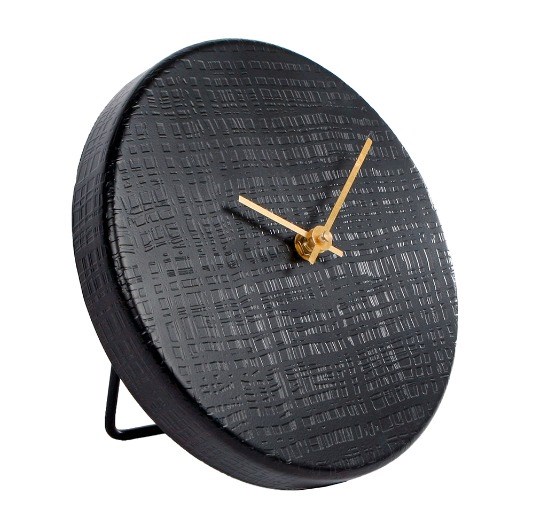 Tafelklok New Moon is rond van model en geheel van zwart metaal.