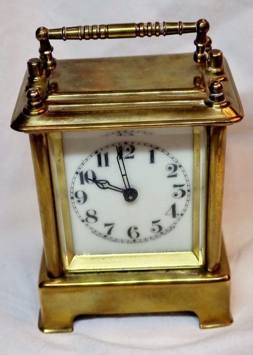 Zeer zeldzame Amerikaanse reisklok met wekker gemaakt door waterbury clock & Co, uitstekende staat, zwaar en massief, messing en gefacetteerd glas, het horloge werkt en loopt zeer goed. Het alarm werkt, mechanisme handopwinder gemaakt tussen gepatenteerd