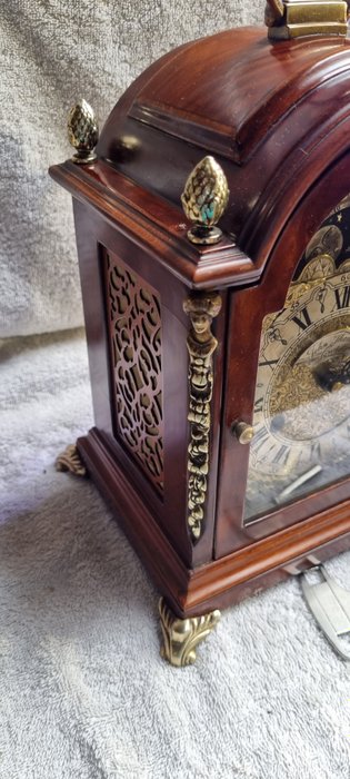Hele fraaie in John Thomas London klok gemaakt bij Wuba Warmink Nederland. De klok is mooi verguld en verzilverd. De ornamenten zijn van glimmend gepoetst brons en messing. Deze klok heeft mooie ajour klankvensters erg groot en in ongerepte staat. Onbeschadigd dus. Deze klok is erg oud 68 jaar maar door regelmatig onderhoud en recent nog is de klok nog als nieuw. Hij slaat ieder half uur op de dubbele bellen met twee hamers. Het hele uur gevolgd door de slagen van het uur. Mooi getuned! De kast van de klok is van onverwoestbaar wortelnotenhout erg slijtvast. Bij verzending zal de klok erg goed ingepakt worden maar dit geeft hoe dan ook een klein risico dit is voor de koper Ophalen is ook een veilige optie u kunt de klok dan goed werkend zien. Boven de verzilverde wijzerplaat in de toog loopt een maan/zon kader mee en weergeeft De stand van de hemellichamen weer. Mooi verzilverd gegraveerd oud Hollandse taferelen. Het uurwerk is geheel geresiveerd en loopt prima de klok heeft altijd in rookvrije omgeving gestaan. De cijfers zijn in Romeinse cijfers maar uiteraard ook metrisch. Het glaswerk is geslepen en nog prima. Het is een mooie klok voor huiskamer of kantoor.