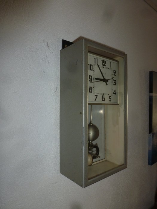 Een mooie prima lopende elektromagnetische klok van de Franse fabrikant Brillie. De klok heeft een industriele look zoals dat momenteel helemaal in is. Een zgn, moederklok. Deze klok loopt op een batterij van 1 ½ volt en stopt wanneer de batterij leeg is. Langer dan een jaar. De klok heeft een prachtige wijzerplaat die in de jaren 50 helemaal in was. De klok heeft een metalen kast en een marmeren achterkant. De slinger komt in beweging door een elektrische impuls en een magneet zorgt door afstoting dat de slinger in beweging blijft. De klok wordt geleverd met een ophangbeugel.De foto’s maken deel uit van de beschrijving.