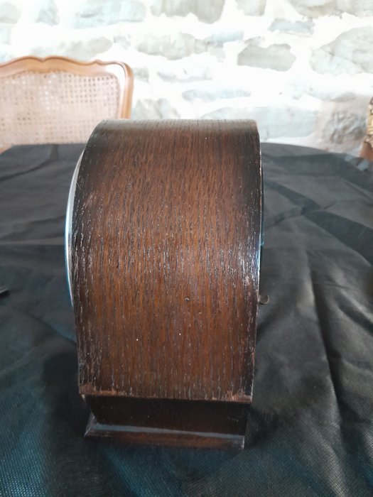 Een compacte eikenhouten Smiths Enfield pendule gemaakt omstreeks midden 20e eeuw die op het hele en halve uur slaat.