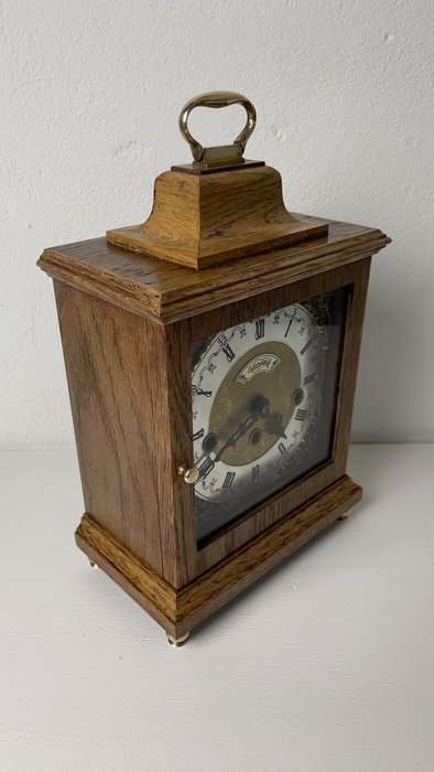 Goed werkende Westminster klok met een fraaie slag om het kwartier.Deze Westminster is uitgerust met een silencer.Met deze hendel kan je het geluid van de slag uitzetten.Het uurwerk is van het type 340-020.