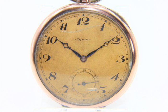 Prachtig verguld "Alpina" zakhorloge. Het heeft een diameter van 48 mm, dikte 12 mm. gewicht van 66,6 gram. Begin 1900. Champagnekleurige wijzerplaat met Arabische cijfers. Compleet mechanisme veer eraf, werkt niet. Niet te missen.