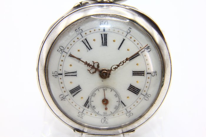 Schitterend zilveren horloge. Uit de late jaren 1800. Het horloge is van gekeurd zilver, meet 42 mm, totaal gewicht 57,8 gram. Wat het onderscheidt, is de prachtig gebeitelde kast en het centrale monogram dat de schittering verbetert. Wijzerplaat met Romeinse cijfers. , compleet mechaniek maar in werking te stellen. Uitzonderlijke schoonheid en originaliteit. Verzamelbaar en draagbaar.. Absoluut niet te missen.