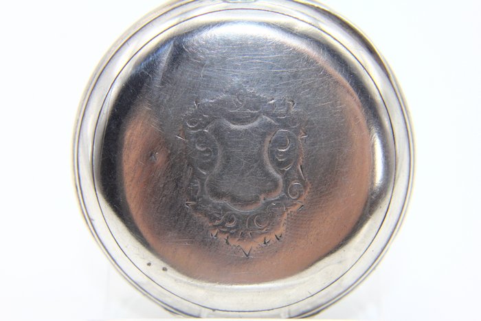 Schitterend zakhorloge in zilver. Begin 1900. Meet 47 mm. gewicht 78,8 gram. Diepte 15 mm. Wat het onderscheidt, is de prachtig gebeitelde kast met centraal monogram. Wijzerplaat met Romeinse cijfers. Uitstekende staat, compleet te reviseren, werkt niet. Verzamelbaar. Niet te missen.