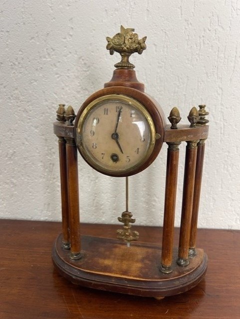 Mooi mahoniehouten tafelklokje met fraaie slinger en sleutel.