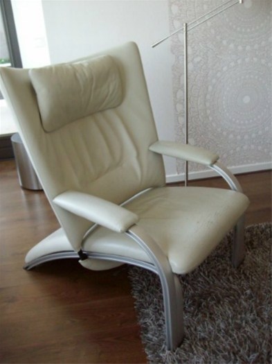 Heeft wel wat breukjes in het leer,als hij in de lange stand staat bij de voeten,en kort op de zittng (zie foto) ook op de arm leuning.
