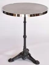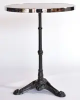 Bistrotafel marmer rond met verchroomde rand en met gietijzeren voet. Het marmeren tafelblad is Ø 57 doorsnee en heeft een chromen rand van 3 cm dik. De tafel is 73 cm hoog. Het tafelonderstel is gemaakt van gietijzer en heeft een 3-teens voet. Deze sfeervolle marmeren bistrotafel is geschikt voor diverse doeleinden.