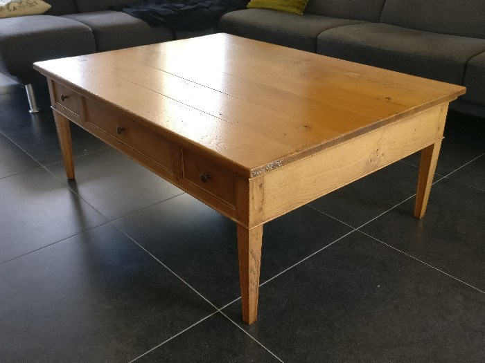 Prachtig afgewerkte salontafel in eikenhout. De tafel is voorzien van 3 doorlopende lades voor het opbergen van spullen die je graag bij de hand houdt.