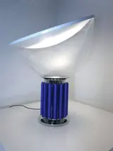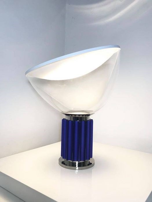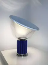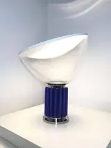 Klein tafellampje 'Taccia' met indirect en gereflecteerd licht. De lamp bestaat uit een glanzend wit gelakte aluminium reflector, die aan de binnenkant mat wit is. De diffusor in transparant geblazen glas is verstelbaar. Behuizing van geëxtrudeerd aluminium in geanodiseerde paarse verf. Het netsnoer is 190 cm lang, met AAN/UIT-dimmerschakelaar.