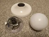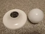 De structuur van de lamp is van wit geëmailleerd metaal en de bol is van opaalglas.