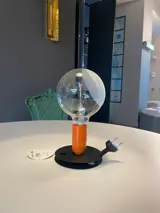 Tafellamp die direct, diffuus licht geeft. De basis van geanodiseerd aluminium dient om overtollig netsnoer op te bergen. Bakelieten lamphouder, geverfd om te passen bij de schakelaar in de kleuren oranje en zwart. Heldere bollamp is gedeeltelijk gezandstraald om het licht te verspreiden.