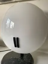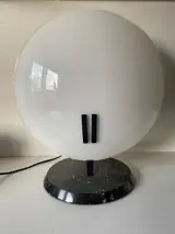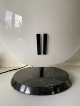Made of high quality white glass with black metal structure and details and a beautiful round, black marble foot. This all together combines into an elegant style that makes this lamp really stand out in the decor! the lamp emit a beautiful warm light that is slightly diffused by the glass and addbrightness and warmth to the decor. A wonderful find of mid-century design in highly recognizable Italian style!