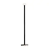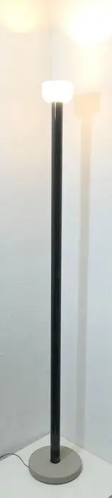 De lamp bestaat uit een betonnen voet, een chocoladebruine aluminium behuizing en een diffusor van wit glas.