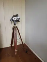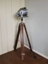 Prachtige ORIGINELE Theaterlamp, theaterspot, vloerlamp op een mooi ongeveer 25jaar oude vintage style teakhouten statief met koper/messing beslag.
