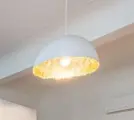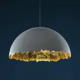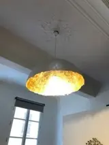 Deze ophanging, een echte lichtgevende sculptuur, kleedt uw interieur met zijn unieke en dromerige aanwezigheid. PostKrisi is het resultaat van een opmerkelijk werk over vorm en materiaal. Het bestaat uit een grote schaal van glasvezel. De buitenkant is wit geverfd terwijl de binnenkant is bedekt met met de hand aangebracht bladgoud. Dit nauwgezette vakmanschap geeft leven aan een prachtige onregelmatige textuur die speelt met reflecties en licht. Indirecte verlichting is goudkleurig, warm en aangenaam.
