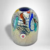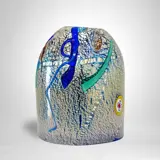 Met behulp van een massa warm gekleurd glas, bedekt met echt bladzilver, worden millefiori murrine en gekleurde wandelstokken met een draaiend gebaar verzameld en samengesmolten. Vanaf hier drukt de meester zijn ervaring in het object door de glasmassa met de hand te blazen en vorm te geven totdat hij zijn uiteindelijke vorm heeft bereikt.