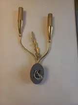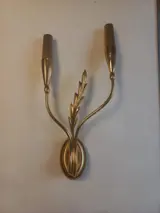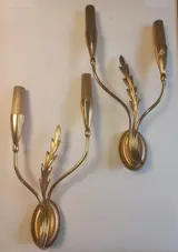 Paar vintage schansen in Hollywood Regency-stijl. De schansen, in mat en glanzend goud, hebben twee lampjes en zijn in uitstekende staat, een van de twee heeft nog het Gaetano Sciolari Roma label van de fabrikant. Op de achterkant van het middenblad is de code 189 gegraveerd.Afmetingen 22x10x45h cm