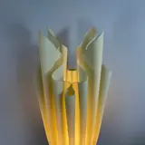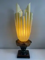 Gemaakt van zachte stof bedekt met een dunne laag hars, gevouwen in een golvende vorm, gemonteerd op een voet in de vorm van een vaas met bladeren. De basis is Engels groen en brons met gouden reflecties.