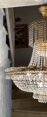 Spectaculaire bronzen kroonluchter gesneden in massief brons met achthoekige kristallen in transparante kleur. Een zeer elegant ontwerp met zijn prachtig uitgesneden randen bezet met grote vierkante kristallen. De kristallen werden één voor één gereinigd en strakker gemaakt en het resultaat is magnifiek, met warmte, glans, glamour, verfijning en elegantie.