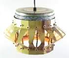 Een unieke hanglamp. Handgemaakt van verschillende materialen. Door de klassieke lantaarnvorm heen zijn de bevestigingsdraden te zien die zijn bekleed met houten fournituren. De zacht koperkleurtinten van de contrasteren prima met de fonkelende bovenzijde.