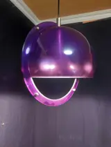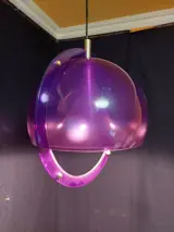 Dit kavel bevat een hanglamp in het paars , is in goede staat , heeft een kleine barst van 3 cm in de harder pvc kijk naar de fotos , moeilijk vindbaar item en echt uit de tijd .