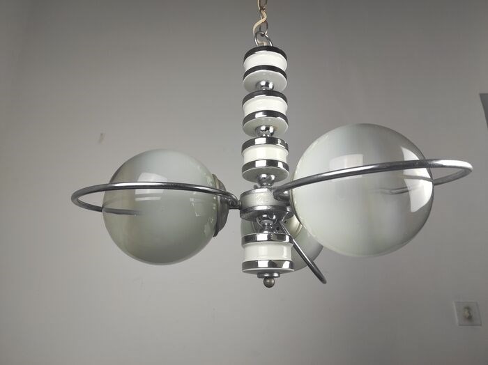 Space Age hanglamp gemaakt in Italië tussen de jaren 70 en 80. Afmeting 46x46x40 cm exclusief de ketting. Goede staat, zeer lichte aanwezigheid van roest.