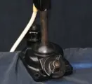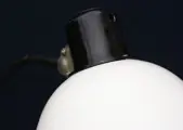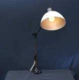 Sjieke karaktervolle lamp uit de jaren 20/49. Materialen: staal, kunststof, bakeliet. De scharnierlamp met twee verstelbare armen is voorzien van een tafelklem heeft een matte draaibare kunststof kap die zorgt voor sfeervol licht. (met een paar gebruikssporen). De voet is van bakeliet waar een kogelgewricht in is opgenomen die zorgt ervoor dat de lamp in elke gewenste stand vast gezet kan worden door een mooie grote vleugelmoer. De lamp is geschikt voor aansluiting op het lichtnet met de stekker.