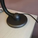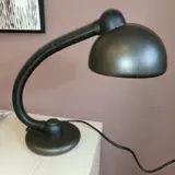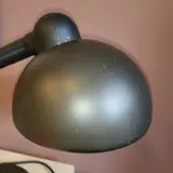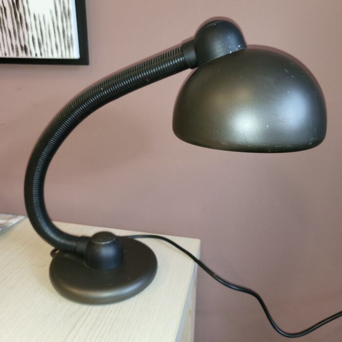 Materialen: Bruin geverfde ronde voet met een grote ingebouwde schakelaar in het midden. Metalen zwanenhals (ijzer) in een bruine flexibele plastic buis. Twee bruine plastic deksels, één bovenop, één voor de schakelaar. Gietijzeren contragewicht in de basis. Bruin gelakte ronde aluminium lampenkap. Bakeliet E27 fitting.