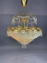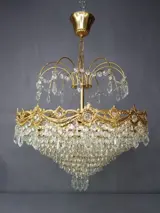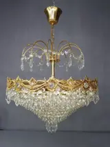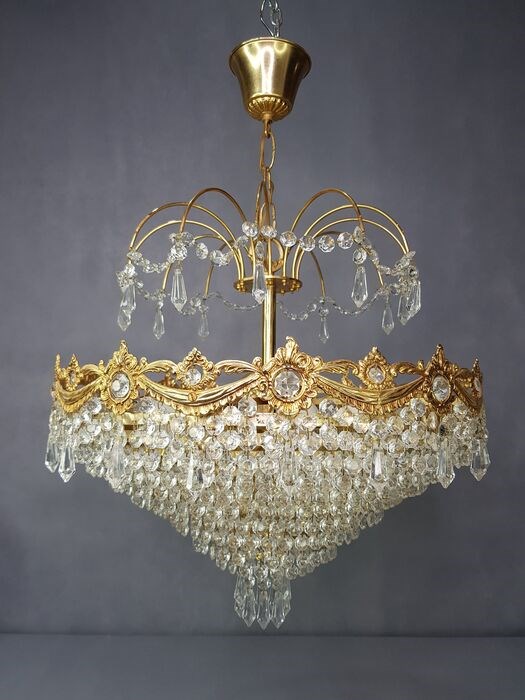 Kroonluchter Hanglamp Gemaakt van messing. Met kostbare details van bladeren en bloemen in de centrale kroon met een ruitvormige afwerking, in totaal dus 8 ringen. Van ouder naar jonger. Waar kristallen aan hangen.In het bovenste gedeelte een structuur in de vorm van een palmboom waar kristallen aan hangen en eromheen.Het heeft 6 E14 fitting fittingen