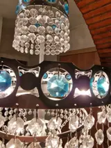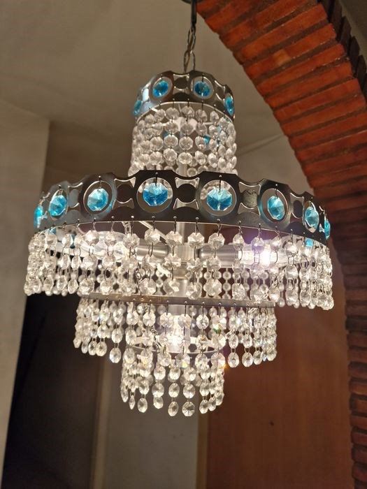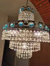 Luxe gebeeldhouwde kroonluchterlamp is gemaakt van platinabrons en middelgrote achthoekige kristallen en de turkooisblauwe kristallen verhogen de glamour van dit stuk, waardoor het veel licht en elegantie krijgt dankzij de 3 centrale gloeilampen en 1 in het onderste gedeelte, beide E14-aansluitingen flitsen veel licht en prestige naar elk type decoratie of ook kamers zowel mediterraan als klassiek