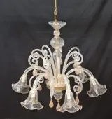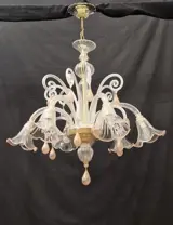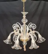 Kroonluchter in transparant en roze artistiek Murano-glas met gouden tinten. Wanneer de warmte van de ovens en de vaardigheid en behendigheid van de glasmeesters wordt omgezet in kunst: de kroonluchter bestaat uit 6 gebogen armen met een bloemvormige beker met roze tinten, hangende bladeren en hoge gekrulde bladeren met een roze druppelhanger met gouden tinten, het centrale lichaam is gemaakt van geblazen glaselementen met een versierde hanger met roze tinten. Object van hoog Venetiaans vakmanschap gemaakt met verschillende glasbewerkingstechnieken. De kroonluchter wordt volledig gedemonteerd om de verzending te vergemakkelijken en elk onderdeel wordt met uiterste zorg verpakt.