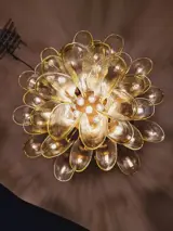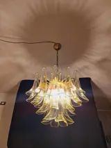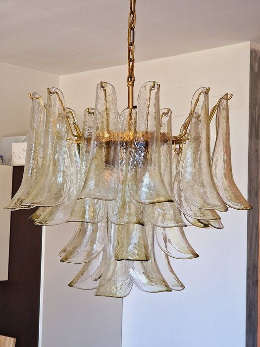 Prachtige hanglamp samengesteld uit een messing structuur en 36 Murano glazen bladen.
