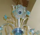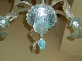 Kroonluchter van kristal en aquamarijn gekleurd glas, hoge bloem- en bladelementen.