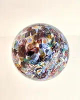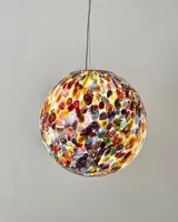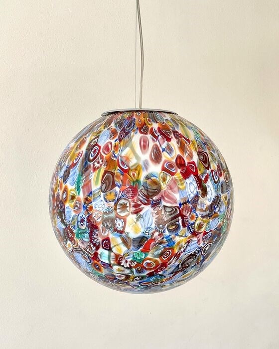 Het is handgemaakt met oneindig veel kleine glazen tegels genaamd "MURRINE", elke afzonderlijke murrina heeft verschillende motieven en kleuren, deze worden vakkundig gesmolten, door de meester-glasmaker, op een massa melkachtig glas, en door het blazen zal het de bolvorm aannemen van deze kolossale grote kroonluchter.