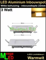 De LED inbouw spot is gemaakt van duurzaam aluminium en de LEDspot is voorzien van 3 watt Hi Power SMD LEDs in de kleur warmwit 2800-3000K en is totaal slechts 22mm hoog