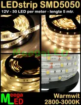 Deze Flexibele LEDstrip is overal in uw huis, auto, carvan of camper te gebruiken. De 5050 SMD LEDs geven een krachtig en mooi egaal verspreid licht af omdat de LED op gelijke afstand op de strip zitten. Deze LEDstrip is verkrijgbaar in de kleuren Warmwit, Wit, Amber, Rood, Groen, Blauw en op verzoek ook in RGB met AB en controller.