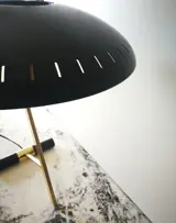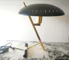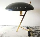 Ik presenteer u een prachtige tafellamp van de beroemde architect en benoemt Louis Kalf (Nederland) het Z- of Decora-model, met zijn concave kap die verwijst naar het beroemde Evoluon-museum in Eindhoven. De lamp is in zeer goede staat en werkt perfect en het is zeer zeldzaam om er een te vinden die in zeer goede staat is. De lamp is 42cm hoog, 32cm lang en diep. Het is deze prachtige lamp die een Loftlook zal geven aan je interieur. De verzending zal met de grootste zorg en controle gebeuren.