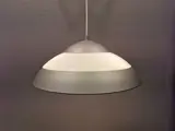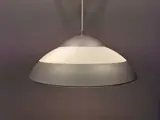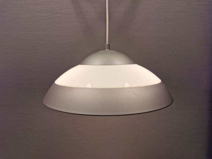 Helemaal afgewerkte hanglamp van het Deense Louis Poulsen, met 3 lichtbronnen, gemaakt van metaal met kappen van plexiglas, in mooie grijze en witte kleuren.