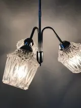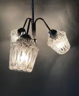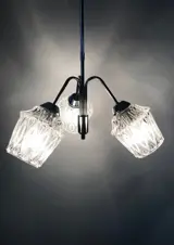 Mooie vintage hanglamp geproduceerd in de jaren 50-60, vermoedelijk door Massive. Deze heeft een lange chromen staaf die uitmondt in 3 glazen lampenkappen. De lampenkappen hebben een organische vorm en een mooie wisselwerking tussen mat en transparant glas, ze zijn elk 15cm hoog en 12cm breed. De lamp is in goede vintage conditie met nog de originele bekabeling. Foto’s vormen onderdeel van de omschrijving.