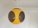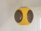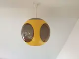 Geel rond model Space Age Bug Eye hang/plafondlamp van Massive in zeer goede staat. Nauwelijks gebruikssporen. Geen barsten of andere mankementen, met zeer lichte krasjes op de doorzichtige kunststoffen/ruiten die gerelateerd zijn aan de leeftijd van de lamp, zie foto's.